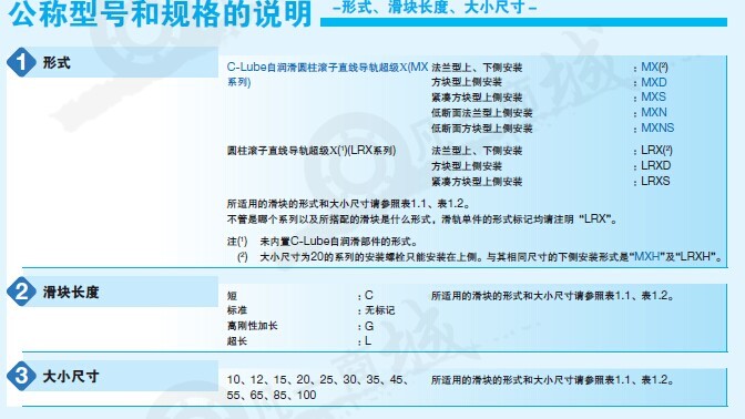 IKO直線導軌LRX系列可發揮最高滾動導向性能的圓柱滾子型直線導向設備:該系列IKO直線導軌是最大限度發揮圓柱滾子的優異特性,使承載負荷、剛性、摩擦特性、行走精度等各個方面的特性都達到最高性能的直線導向設備。IKO直線導軌C-Lube自潤滑、免維護LRX系列,滿足多樣需求的豐富產品群滑塊以法蘭型為主,還有截面高度低的低斷面法蘭型、低斷面方塊型等5種類型,滑塊長度在相同的截面尺寸下有4種不同的類型,用戶可根據機械、裝置的規格選擇最合適的IKO直線導軌。